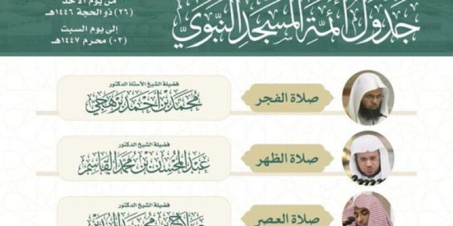 أوضحت رئاسة الشؤون الدينية بالمسجد النبوي بالمدينة المنورة عن جدول الأئمة المكلفين بإمامة الصلوات للفترة من 26 ذي الحجة إلى 3 محرم 1447هـ. يأتي هذا في إطار تنظيم الإمامة وتوفير أجواء روحانية تامة للمصلين والزوار.