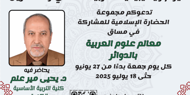 تنظم مجموعة الحضارة الإسلامية مساقًا تدريبيًا بعنوان “معالم علوم العربية بالدوائر”، في إطار فعاليات يوم ويكيبيديا العربية الحادي والعشرين، وذلك خلال الفترة من 27 يونيو إلى 18 يوليو 2025، عبر منصة Google Meet.