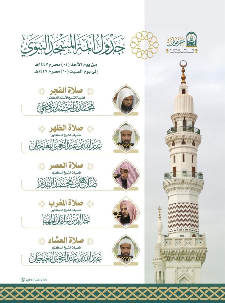 أوضحت رئاسة الشؤون الدينية بالمسجد الحرام والمسجد النبوي عن جدول الأئمة المكلفين بإمامة الصلوات للفترة من يوم غد الأحد 4 محرم حتى يوم السبت القادم 10 محرم 1447هـ، وذلك في إطار تنظيم شؤون الإمامة وتوفير أجواء روحانية تامة للمصلين والزوار.