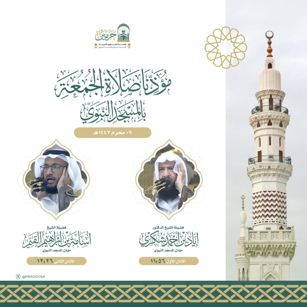 أوضحت رئاسة الشؤون الدينية بالمسجد الحرام والمسجد النبوي أسماء المؤذنين المكلفين برفع أذان صلاة الجمعة يوم غدٍ، الموافق التاسع من شهر محرم 1447هـ، وذلك في إطار جهودها المستمرة لتنظيم أوقات الصلاة وإعلام قاصدي وزوار الحرمين الشريفين بمواعيد الأذان والمؤذنين المكلّفين.