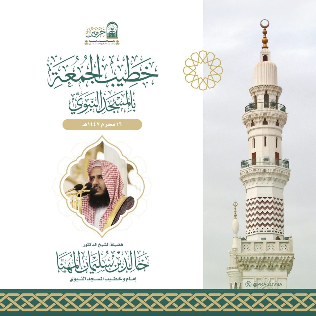 رئاسة الشؤون الدينية بالمسجد الحرام والمسجد النبوي الشريف تحدد خطيبي الجمعة في الحرمين الشريفين ليوم بعد غد 16 محرم 1447هـ