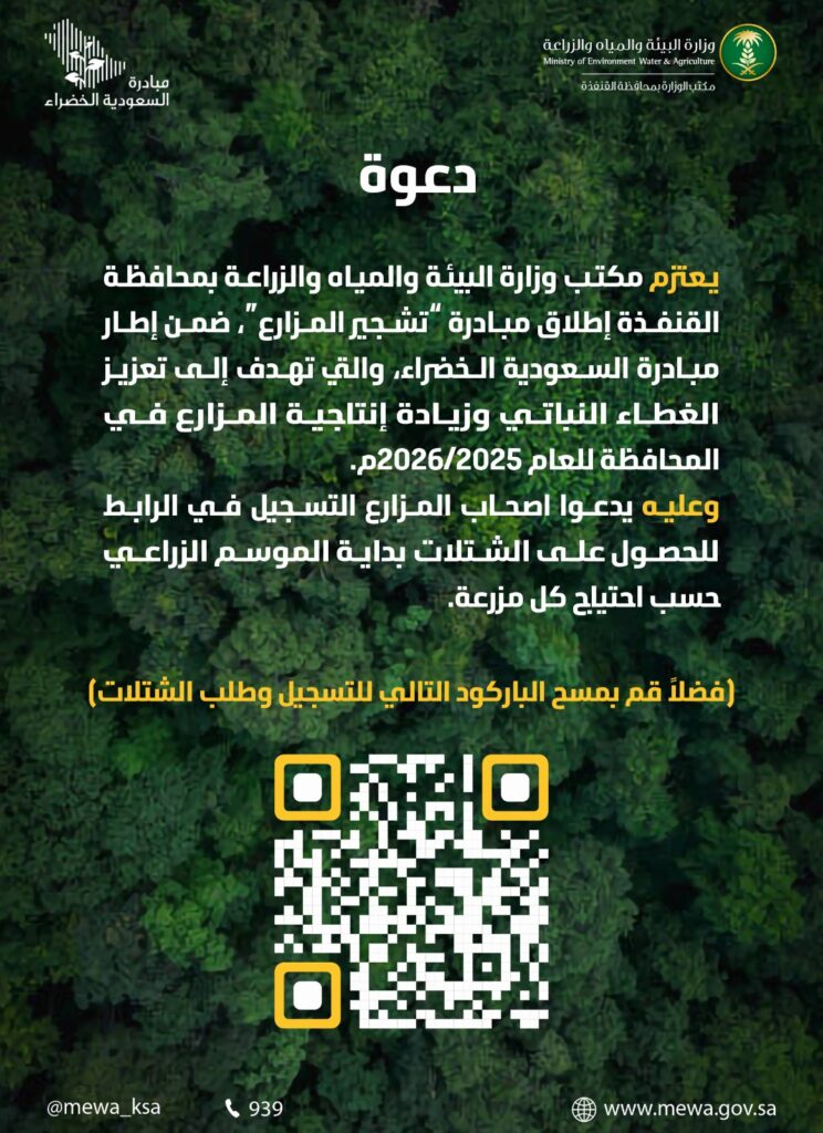 ودعا مكتب الوزارة جميع أصحاب المزارع إلى المبادرة بالتسجيل، من خلال مسح الباركود المرفق في الإعلان، أو عبر الرابط الإلكتروني المخصص، وذلك لضمان إدراج مزارعهم ضمن خطة التشجير.