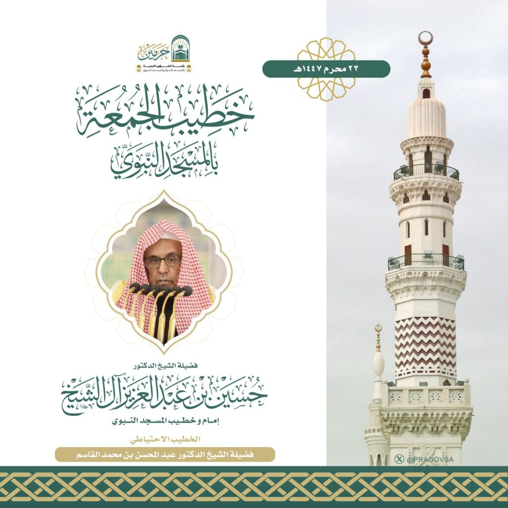 فيما يخطب ويؤم المصلين في المسجد النبوي فضيلة الشيخ الدكتور حسين آل الشيخ