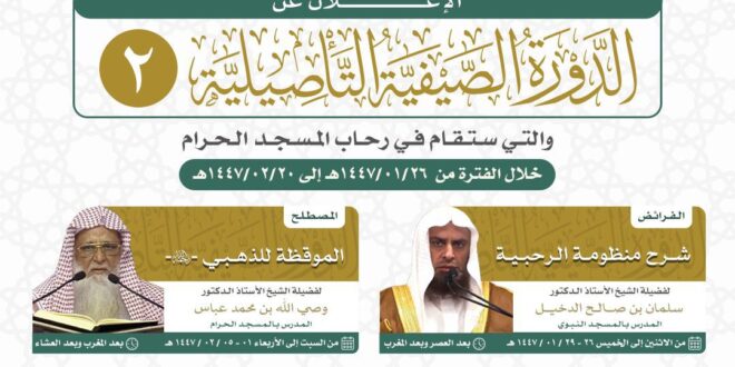 أوضحت رئاسة الشؤون الدينية بالمسجد الحرام والمسجد النبوي عن إقامة الدورة الصيفية التأصيلية الثانية لعام 1447هـ، والتي تُعقد في رحاب المسجد الحرام بمكة المكرمة، خلال الفترة من يوم غد الإثنين 26 محرم حتى نهاية 20 صفر 1447هـ.