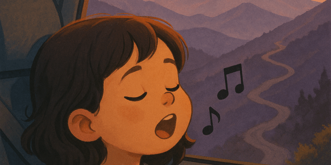 طفلة في المقعد الخلفي، لا تملك من وسائل التعبير سوى الغناء. لكنها لا تغني ما تسمعه في التلفاز، ولا تردد ما يُقال لها. بل تصنع لحنها الخاص من رائحة الهواء، من أشكال الغيوم ، من تعب الطريق، ومن غموض الجبل البعيد.