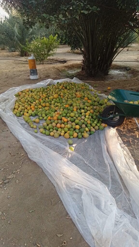 وشملت الجولات الميدانية الاشراف على حصاد ثمار البرحي من نحو 600 نخلة من أحد المزارع النموذجية، إضافة إلى مزرعة نموذجية اخرى بمركز ثريبان تضم 380 نخلة برحي وما يقارب 600 شجرة حمضيات تم جني ثمار الليمون والبرتقال منها.