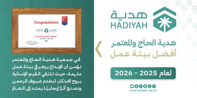 حصلت جمعية هدية الحاج والمعتمر على شهادة أفضل بيئة عمل لعام 2025 – 2026، وهي شهادة اعتراف دولية تمنحها منظمة “Great Place To Work” للجهات التي توفر بيئة عمل متميزة لموظفيها، ويأتي هذا الإنجاز تأكيدًا على التزام الجمعية بتهيئة بيئة عمل مُلهِمة، تجمع بين القيم الإنسانية وروح الابتكار، لخدمة ضيوف الرحمن وتحقيق أثر إيجابي يمتد إلى العالم.