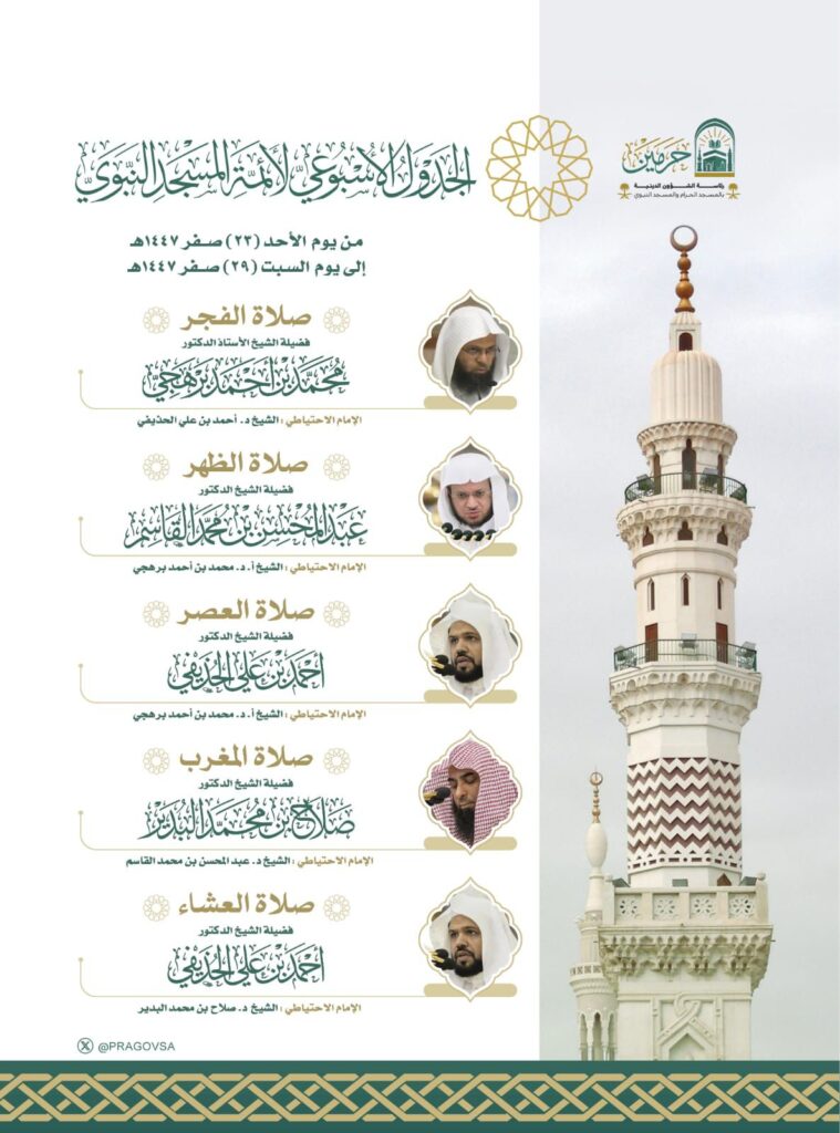 أوضحت رئاسة الشؤون الدينية بالمسجد الحرام والمسجد النبوي عن الجدول الأسبوعي لأئمة الحرمين الشريفين للفترة من يوم الأحد 23 صفر إلى السبت 29 صفر 1447هـ وذلك في إطار حرصها المستمر على تنظيم الشعائر، وتمكين المصلين من أداء صلواتهم في أجواء من الطمأنينة والسكينة.