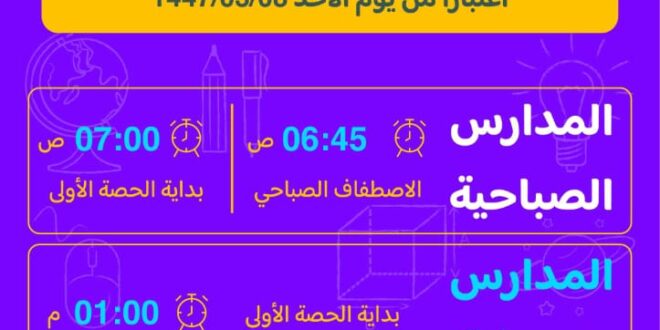 وبينت الإدارة أن موعد الاصطفاف الصباحي الساعة 6:45 صباحًا، وبداية الحصة الأولى الساعة 7:00 صباحًا، والمدارس المسائية تبدأ الحصة الأولى الساعة 01:00 مساءً، وفي مدارس التعليم المستمرّ للبنات تبدأ الحصة الأولى الساعة 03:00 مساءً، ومدارس التعليم المستمرّ للبنين الساعة 05:00 مساءً.