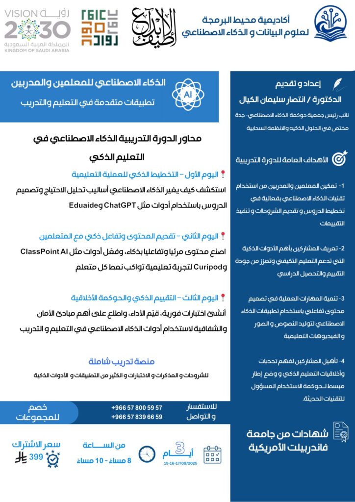 ولهذا السبب، يسعد أكاديمية محيط البرمجة لعلوم البيانات والذكاء الاصطناعي بالتعاون مع مؤسسة طيف الإبداع ومنصة محبي مكة، دعوتك للانضمام إلى الدورة التدريبية المتقدمة: “الذكاء الاصطناعي للمعلمين والمدربين – تطبيقات حديثة في التعليم والتدريب”.