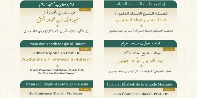 رئاسة الشؤون الدينية بالمسجد الحرام والمسجد النبوي تحدد خطيبا الجمعة في الحرمين الشريفين ليوم 27 ربيع الأول 1447هـ
