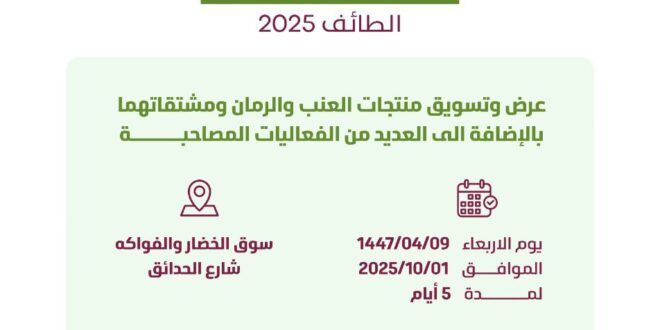 ‏يستعد مكتب وزارة البيئة والمياه والزراعة بمحافظة الطائف، لاطلاق فعاليات مهرجان العنب والرمان 2025 يوم الأربعاء 1 أكتوبر عند الساعة الخامسة مساء، بالشراكة مع القطاع الخاص، في إطار المبادرات الهادفة إلى إبراز مكانة المحافظة الزراعية وتعزيز استدامة منتجاتها الموسمية المميزة.