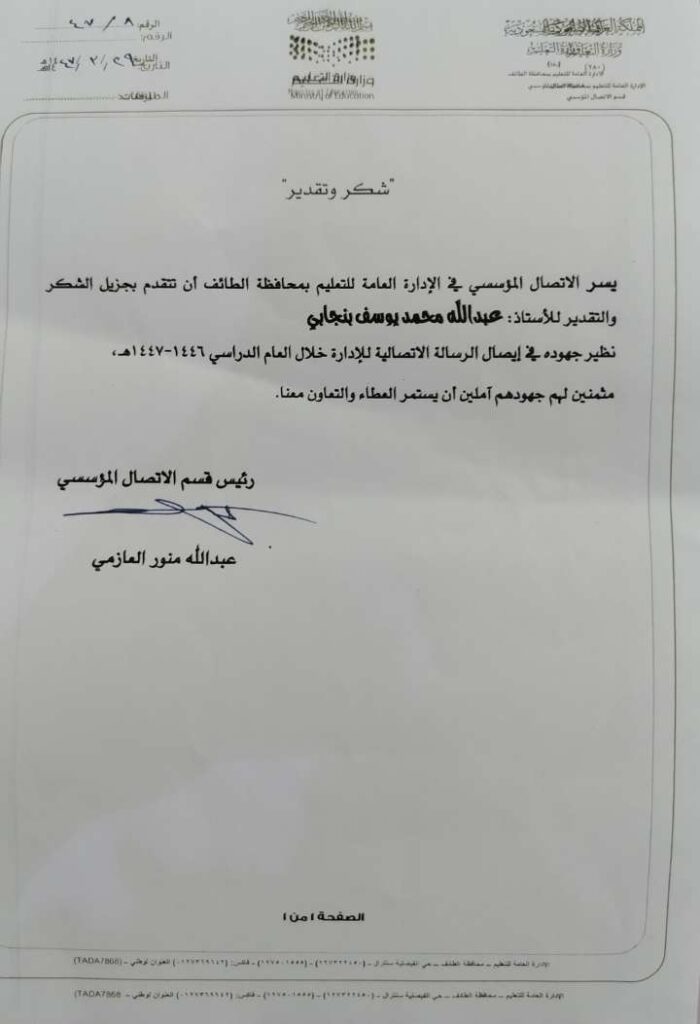 ببالغ الفخر والاعتزاز، تلقينا خطاب الشكر والتكريم من سعادة رئيس قسم الاتصال المؤسسي بتعليم الطائف، الأستاذ عبدالله منور العازمي.