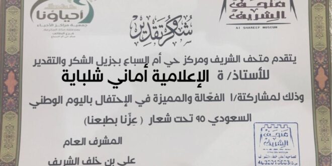 في لفتة تقديرية لدورها الفعّال في تعزيز الروح الوطنية، كرّم متحف الشريف ومركز حي أم السباع، التابع لجمعية مراكز الأحياء بمحافظة مكة المكرمة فرع العطايف، الزميلة الإعلامية الدكتورة أماني شلباية.