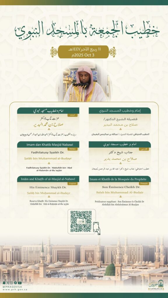 أوضحت رئاسة الشؤون الدينية بالمسجد الحرام والمسجد النبوي، عن أسماء خطيبا وإماما صلاة الجمعة في الحرمين الشريفين ليوم بعد غد الجمعة 11 ربيع الآخر 1447هـ وذلك ضمن جدولها الدوري لتنظيم الإمامة والخطابة.