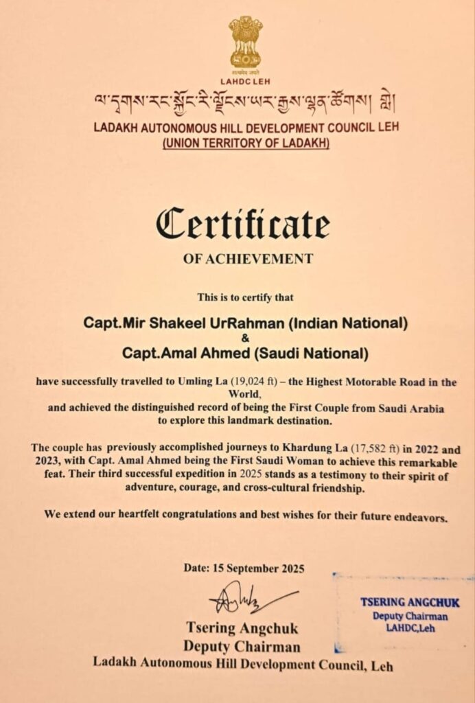 كما حقق الزوجان رقمًا قياسيًا جديدًا كأول زوجين يصلان لأعلى ممر قابل للقيادة في العالم، أوملينجلا، على ارتفاع 19,024 قدمًا. ورفعا العلم السعودي في اليوم الوطني السعودي الـ 95.
