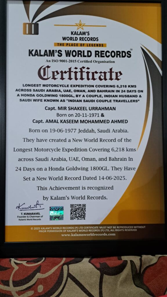وبنهاية رحلتهما بالهند قاموا بالتوجه الى مدينة شيناي حيث تلقى الكابتن مير شكيل الرحمن والكابتن أمل أحمد جائزة عبارة درع وشهادة تقدير لإنجازهما القياسي،وتشير الشهادة إلى رحلتهما المذهلة وتعترف بهما كأصحاب الرقم القياسي لأطول رحلة دراجة نارية،
