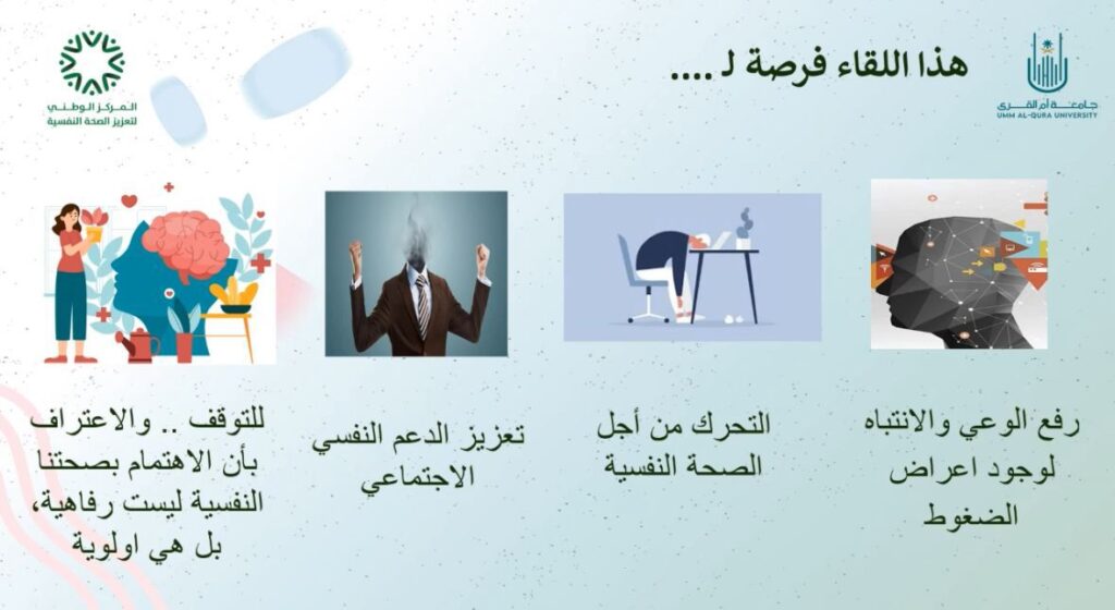 تزامناً مع اليوم العالمي للصحة النفسية ؛ نفذت الإدارة العامة للتعليم بمنطقة مكة المكرمة – ممثلةً في قسم الثقافة المؤسسية بإدارة الموارد البشرية – وبالتعاون مع المركز الوطني لتعزيز الصحة النفسية اليوم الثلاثاء ٢٢ / ٤ / ١٤٤٧ هـ لقاء بعنوان “إدارة الضغوط في بيئة العمل” وذلك ضمن برنامج رفاه.