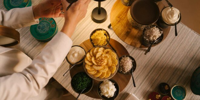 وأستخدم الشيف مكونات فاخرة أبرزها كافيار برونييه (Prunier Caviar) وأدوات مائدة من كريستوفل (Christofle)، ليجسّد مزيجاً من الأناقة الباريسية في قلب الصحراء السعودية.