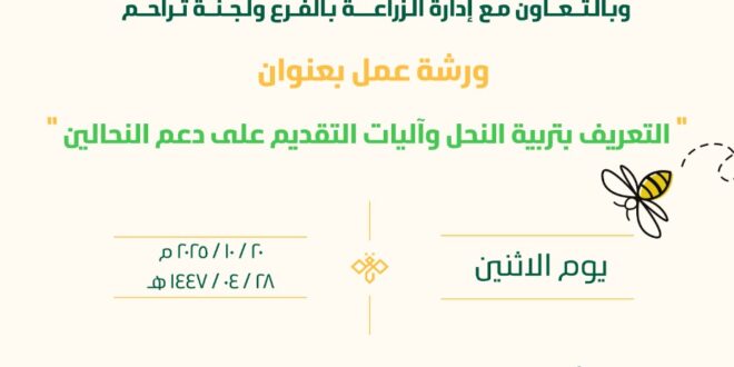 ‏وهدفت الورشة إلى رفع مستوى الوعي لدى المستفيدين وتعريفهم بأساسيات تربية النحل الحديثة وآليات التقديم على برامج دعم النحالين التي تقدمها الوزارة، وذلك في إطار سعيها إلى تمكين الأسر المستفيدة من فرص العمل والإنتاج في مجالات الزراعة والنحل، وتعزيز مفهوم التنمية الريفية المستدامة، كما تخلل الورشة عرض توعوي وتطبيقي حول أساليب العناية بالنحل وإدارة المناحل، إضافةً إلى فتح باب النقاش والإجابة على استفسارات الحضور، وتقديم الإرشادات الفنية التي تمكّن المستفيدين من الاستفادة المثلى من برامج الدعم الموجهة للنحالين المرخصين.