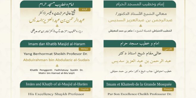 حددت رئاسة الشؤون الدينية بالمسجد الحرام والمسجد النبوي الشريف خطيبا الجمعة في الحرمين الشريفين ليوم بعد غد الجمعة 2 جمادى الأولى 1447هـ