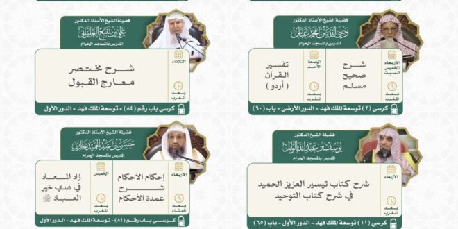 أوضحت رئاسة الشؤون الدينية بالمسجد الحرام والمسجد النبوي عن جدول البرنامج العلمي الدائم بالمسجد الحرام لشهر جمادى الأولى 1447هـ، والذي يضم دروسًا علمية ومحاضرات شرعية يقدمها نخبة من أصحاب الفضيلة أئمة ومدرّسي المسجد الحرام، ضمن جهود الرئاسة في نشر العلم وتعزيز الوعي الديني لقاصدي بيت الله الحرام