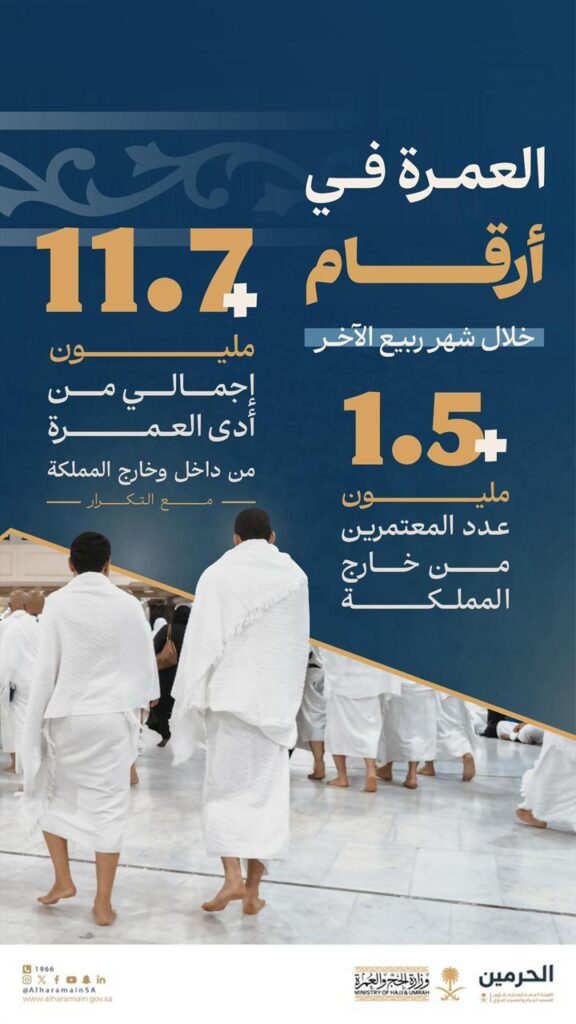 أصدرت الهيئة العامة للعناية بشؤون الحرمين الشريفين إحصائيات بعدد زوار الحرمين الشريفين خلال شهر ربيع الثاني من العام الحالي 1447 هجرية