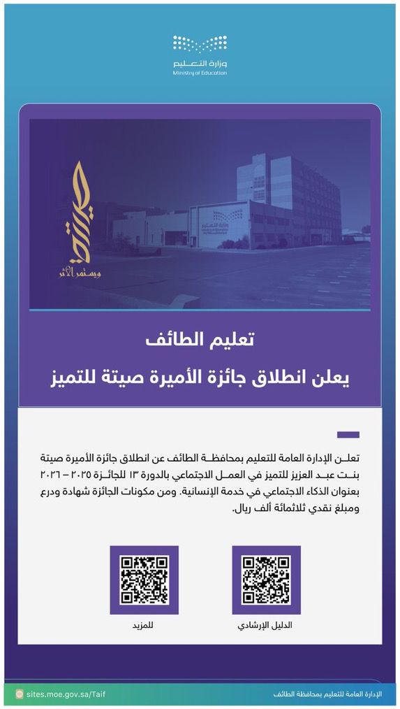 دعت الإدارة العامة للتعليم بمحافظة الطائف منسوبيها إلى الترشح لجائزة الأميرة صيتة بنت عبدالعزيز للتميز في العمل الاجتماعي في دورتها الثالثة عشرة لعام 2025م، التي تُقام تحت عنوان: