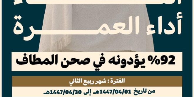 أصدرت الهيئة العامة للعناية بشؤون المسجد الحرام والمسجد النبوي الشريف إحصائيات عن رمن ادى مناسك العمرة خلال شهر ربيع الثاني لعام 1447 هجرية