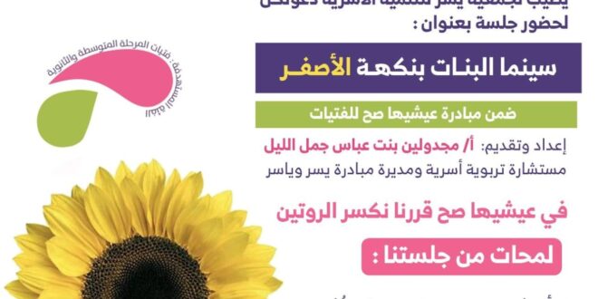 ضمن الأنشطة والبرامج التوعوية والتثقيفية التي تقيمها جمعية يُسر للتنمية الأسريَة بمكة المكرمة تنظم الجمعية برنامج بعنوان:( سينما البنات بنكهة الأصفر)