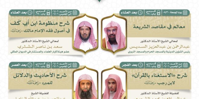 ويشارك في الدورة نخبة من أصحاب المعالي والفضيلة ومدرسي الحرمين الشريفين، وتأتي هذه الدورة برعاية معالي رئيس الشؤون الدينية بالمسجد الحرام والمسجد النبوي الشيخ الأستاذ الدكتور عبدالرحمن بن عبدالعزيز السديس، تأكيدًا لاهتمام الرئاسة بتعزيز البرامج العلمية وتحقيق رسالتها في خدمة العلم الشرعي.