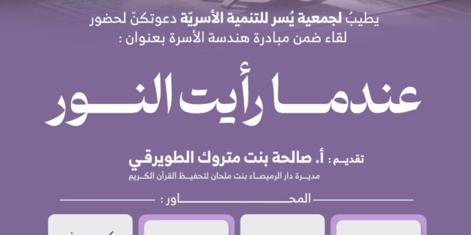 جمعية يسر للتنمية الأسرية بمكة المكرمة تنظم لقاءً مساء يوم غد الثلاثاء بعنوان(عندما رأيت النور )