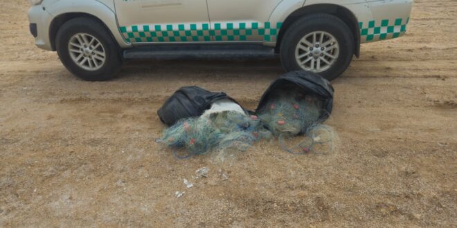 حيث عُثر بحوزة المخالفين خلال عملية الضبط على ستة شباك صيد من نوع “أشورة” المصنوعة من النايلون، وهي أدوات محظورة لما تسببه من أضرار بالغة على البيئة البحرية، وتهديدها المباشر لتوازن النظم البيئية واستدامة المخزون السمكي.