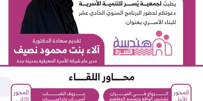 ضمن الأنشطة والبرامج والفعاليات التوعوية والتثقيفية والمجتمعية التي تنظمها جمعية يسر للتنمية الأسرية بمكة المكرمة- تنظم الجمعية لقاء هندسة الأسرة مع سعادة الدكتورة القديرة آلاء بنت محمود نصيف، ضمن البرنامج السنوي الحادي عشر للبناء الأسري.