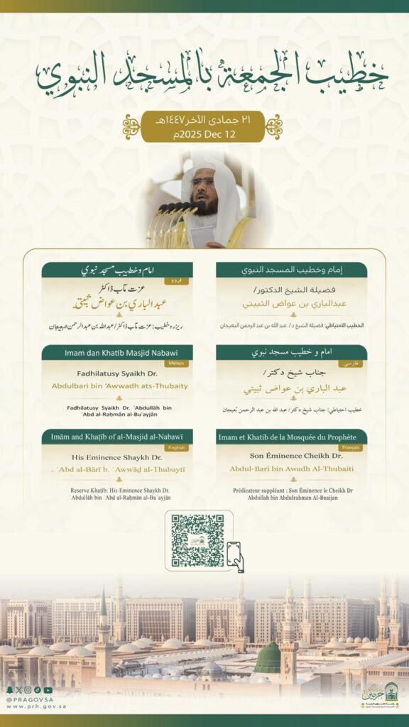 أوضحت رئاسة الشؤون الدينية بالمسجد الحرام والمسجد النبوي، عن خطيبا وإمام صلاة الجمعة في الحرمين الشريفين ليوم بعد غد 21 جماد الآخر 1447هـ وذلك ضمن جدولها الدوري لتنظيم الإمامة والخطابة.