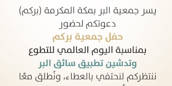 مكة المكرمة، 15 ديسمبر 2025م – تحتفل جمعية البر بمكة المكرمة (بركم)، أول جمعية بر تأسست في المملكة العربية السعودية بترخيص رقم 57، بمناسبة اليوم السعودي والعالمي للتطوع. يأتي هذا الاحتفال ليؤكد على الدور المحوري للتطوع في خدمة المجتمع.
