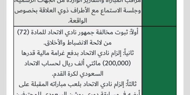 أصدرت لجنة الانضباط والأخلاق بالاتحاد السعودي لكرة القدم قرارًا يقضي بتغريم نادي الاتحاد مبلغ (200) ألف ريال، مع إلزامه بلعب مباراة واحدة دون حضور جماهيري على ملعبه، على أن تُعلّق هذه العقوبة لمدة أربعة أشهر، وتُنفّذ في حال تكرار مخالفة المادة (72) من لائحة الانضباط والأخلاق.