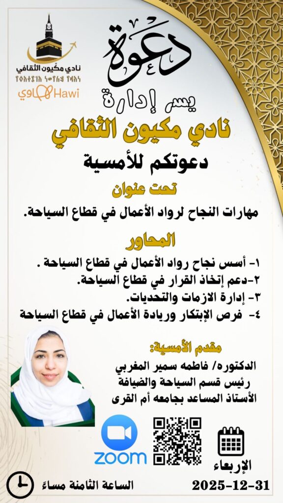 يسر إدارة نادي مكيون الثقافي، وضمن جهودها لتعزيز الوعي المعرفي بريادة الأعمال بما يواكب تطلعات حكومة خادم الحرمين الشريفين الملك سلمان بن عبدالعزيز وولي عهده الأمين الأمير محمد بن سلمان حفظهم الله في تطوير القطاع السياحي، دعوتكم لحضور هذه الأمسية النوعية.
