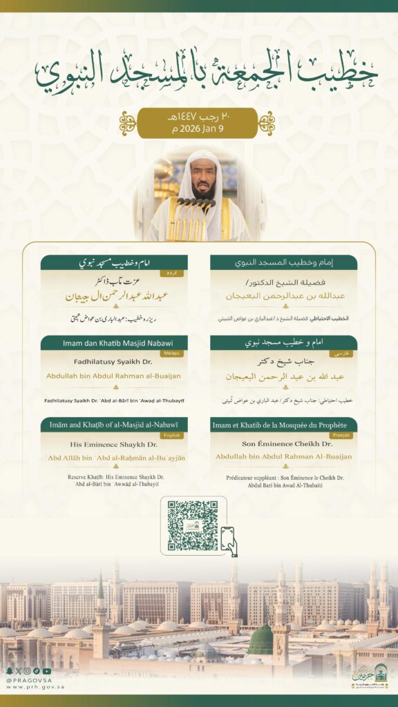 حددت رئاسة الشؤون الدينية بالمسجد الحرام والمسجد النبوي، أسماء خطيبا وإماما صلاة الجمعة في الحرمين الشريفين ليوم غد الجمعة 20 رجب 1447هـ وذلك ضمن جدولها الدوري لتنظيم الإمامة والخطابة.