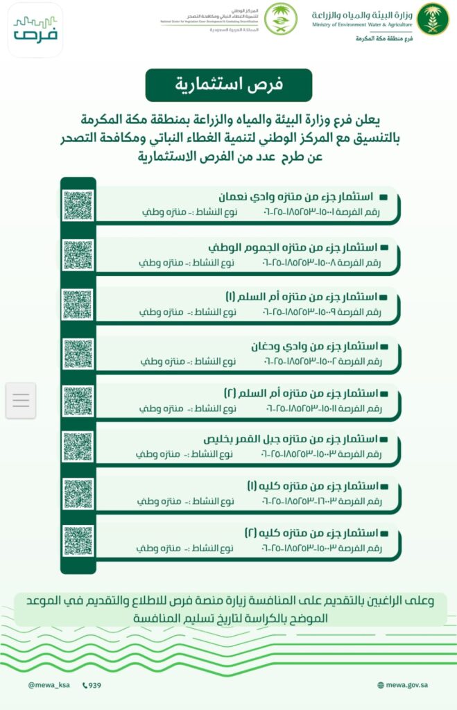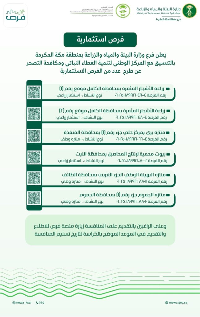 أوضح فرع وزارة البيئة والمياه والزراعة بمنطقة مكة المكرمة، بالتعاون والتنسيق مع المركز الوطني لتنمية الغطاء النباتي ومكافحة التصحر، عن طرح حزمة من الفرص الاستثمارية النوعية في عدد من محافظات المنطقة، وذلك في إطار تعزيز الشراكة مع القطاع الخاص وتحقيق مستهدفات رؤية المملكة 2030 في الجوانب البيئية والتنموية والاستثمارية.