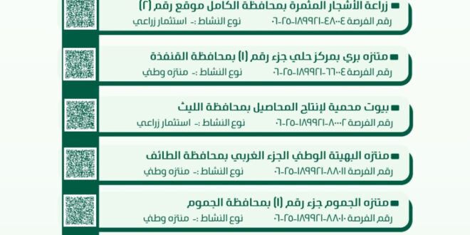 كما تضمنت الفرص مجالات الاستثمار الزراعي والإنتاجي، من خلال إتاحة مواقع لزراعة الأشجار المثمرة في محافظة الكامل، وإنشاء بيوت محمية لإنتاج المحاصيل الزراعية في محافظة الليث، بما يدعم الأمن الغذائي ويعزز الاستفادة من الموارد الطبيعية.
