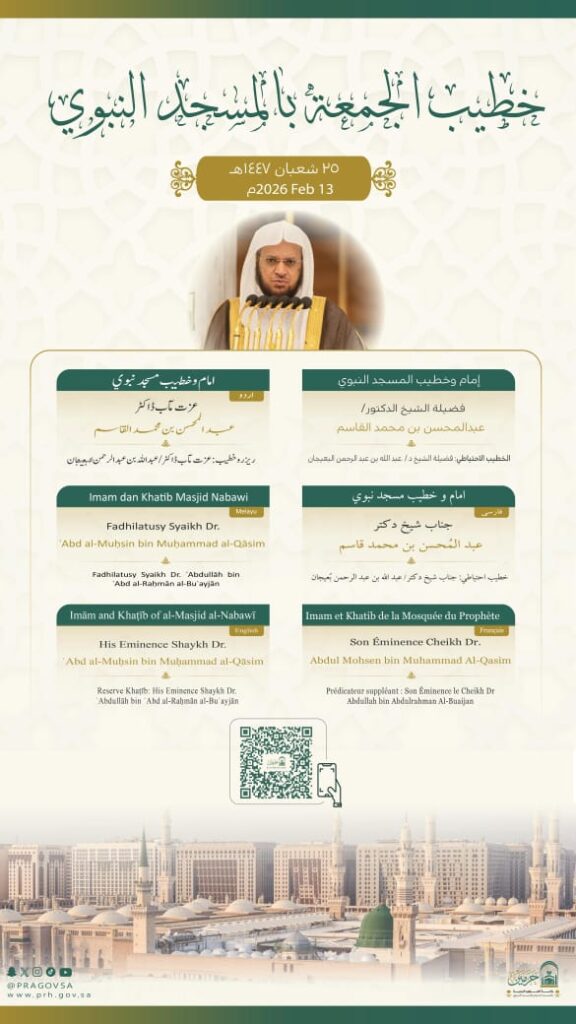 حددت رئاسة الشؤون الدينية بالمسجد الحرام والمسجد النبوي خطيبا وإماما صلاة الجمعة في الحرمين الشريفين ليوم بعد غد الجمعة 25 شعبان 1447هـ وذلك ضمن جدولها الدوري لتنظيم الإمامة والخطابة.