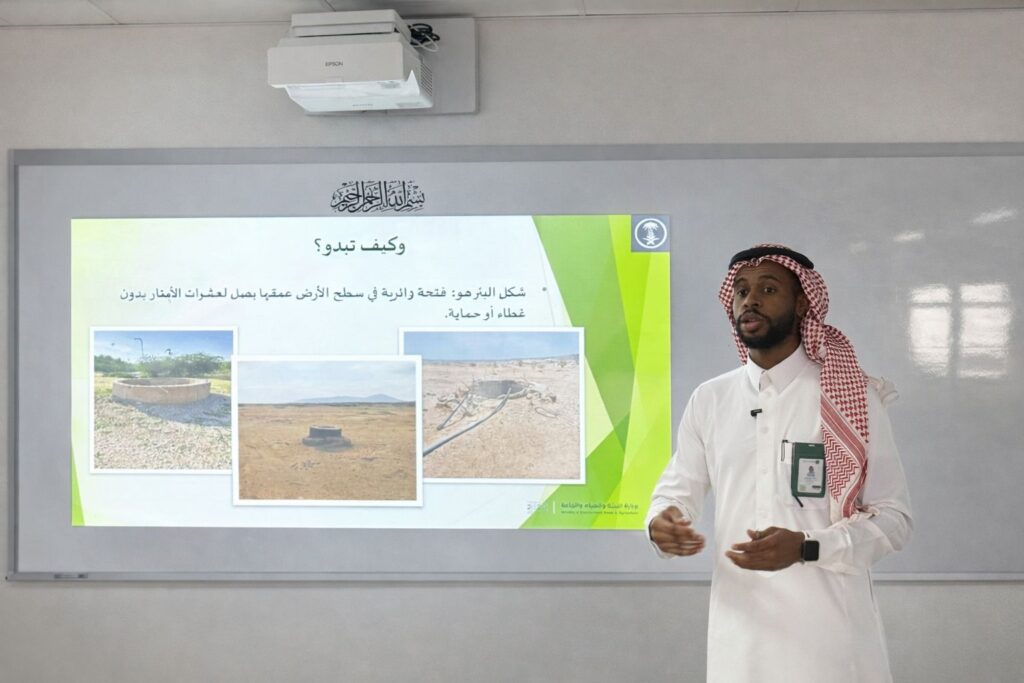 وهدفت المبادرة إلى توعية الطلاب ومنسوبي المدرسة بالمخاطر الجسيمة للآبار غير المغلقة، والتأكيد على أهمية الإبلاغ عنها وردمها أو تأمينها وفق الإجراءات النظامية المعتمدة، لما قد تسببه من حوادث سقوط للأشخاص والحيوانات، إضافة إلى مخاطر تلوث المياه الجوفية وانتشار الآفات، كما تضمنت تقديم مواد توعوية وإرشادات ميدانية وشرحًا مبسطًا لأبرز المخاطر وسبل الوقاية منها، مع التعريف بدور الوزارة في متابعة ومعالجة الآبار المهجورة بالتعاون مع الجهات ذات العلاقة، وسط تفاعل إيجابي من الطلاب والمعلمين.