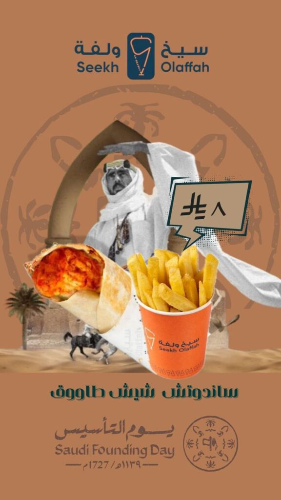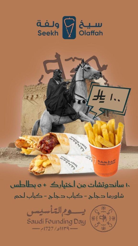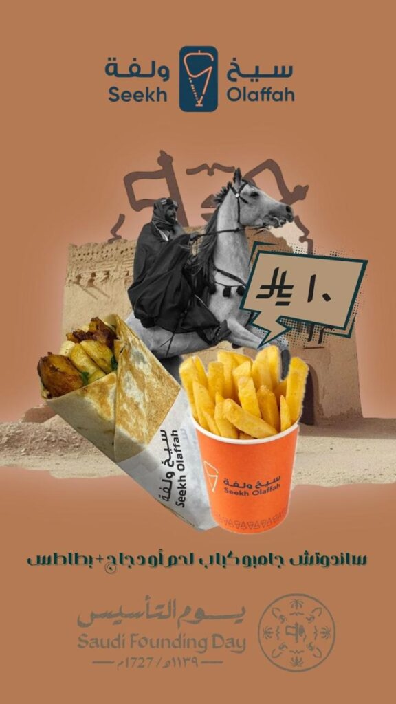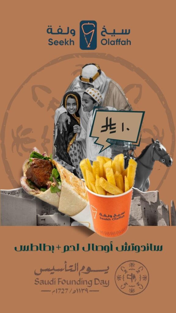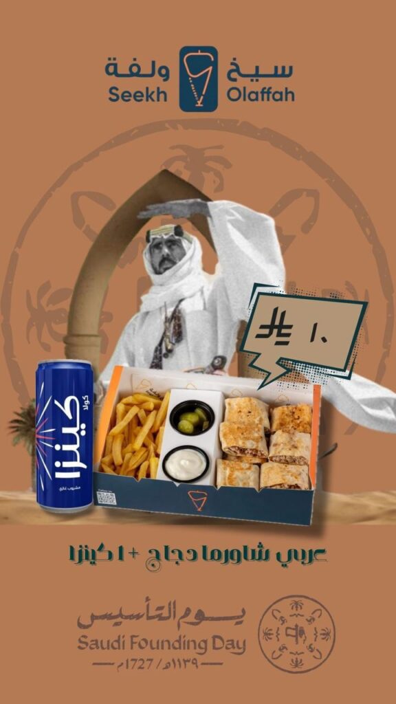 بمناسبة يوم التأسيس، وبفخر يمتد لثلاثة قرون من المجد والاعتزاز تحت ظل قيادة خادم الحرمين الشريفين الملك سلمان بن عبدالعزيز وولي عهده الأمين الأمير محمد بن سلمان حفظهم الله، يسر مطعم “سيخ ولفة” أن يشارككم هذه الفرحة الوطنية بعروض استثنائية تجمع بين أصالة الطعم والروح السعودية الأصيلة.