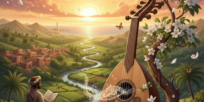 • مناخ الفل والكادي: الطبيعة العطرية في لحج (وامتدادها الطبيعي في جازان) جعلت الموسيقى “فواحة”. فالأغنية اللحجية لا تُسمع فقط، بل تُشم عبر مفردات “الكاذي” و”الخضيرة”.