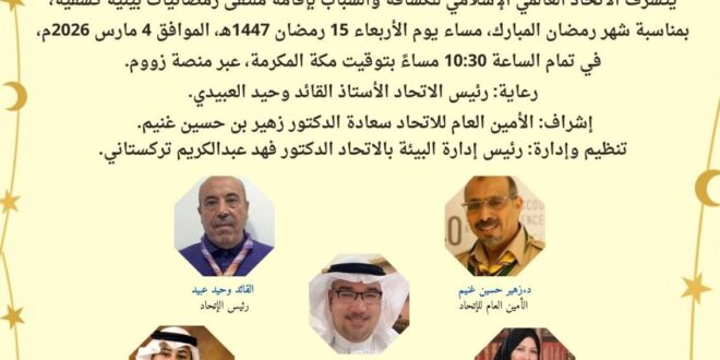 يقيم الاتحاد العالمي الإسلامي للكشافة والشباب أمسية رمضانية بعنوان «ملتقى رمضانيات بيئية كشفية»، وذلك بمناسبة حلول شهر رمضان المبارك، في إطار جهوده لتعزيز الوعي البيئي وترسيخ السلوكيات المستدامة في المجتمع الكشفي.