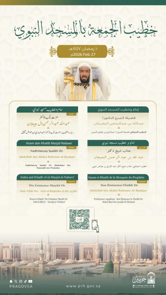 فيما يخطب ويؤم المصلين في المسجد النبوي فضيلة الشيخ الدكتور عبدالله البعيجان