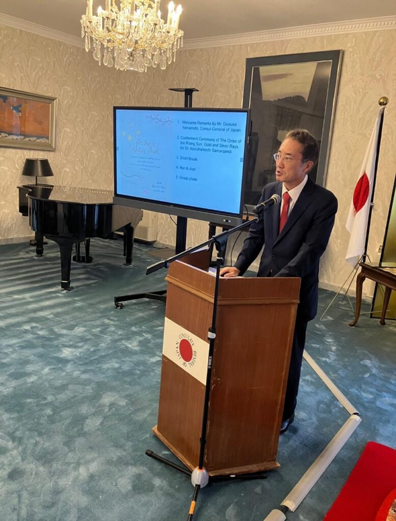 كما ألقى الدكتور سمرقندي كلمته وقدم فيها الشكر لحكومة اليابان على منحها الوسام ولسعادة القنصل على إقامة حفل التسليم.