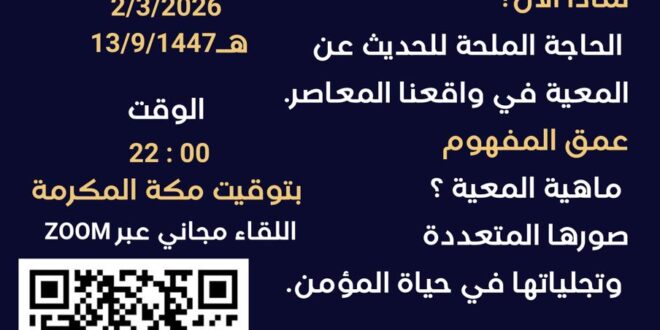 📅 اليوم: الإثنين، 13 رمضان 1447هـ (2 مارس 2026) 🕙 الوقت: 10:00 مساءً (بتوقيت مكة المكرمة) 📍 المكان: عبر تطبيق ZOOM (اللقاء مجاني)