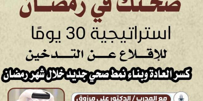 ضمن برنامج «صحتك في رمضان»، الذي يشرف عليه معهد سواعد المستقبل للتدريب، وضمن مبادرة أجاويد 4، يدرب عضو هيئة التدريس بجامعة الملك خالد الدكتور علي مرزوق (30) متدرباً للاقلاع عن التدخين، برفقة فريق متخصص في مجالات الصحة، وعلم النفس، والاجتماع، وقد شرفنا في البرنامج الاعلامي محمد آل غواء، والمدرب الدولي الدكتور محمد العامري، والدكتور جيلان محمد المتخصص في التربية الرياضية والصحية.